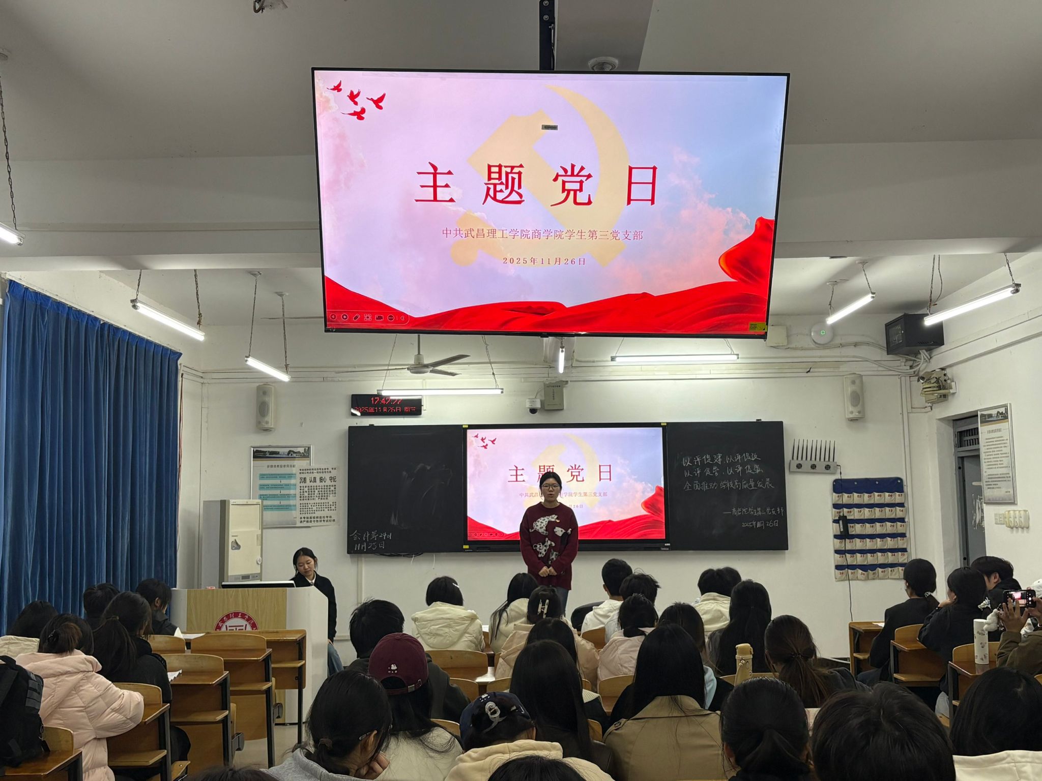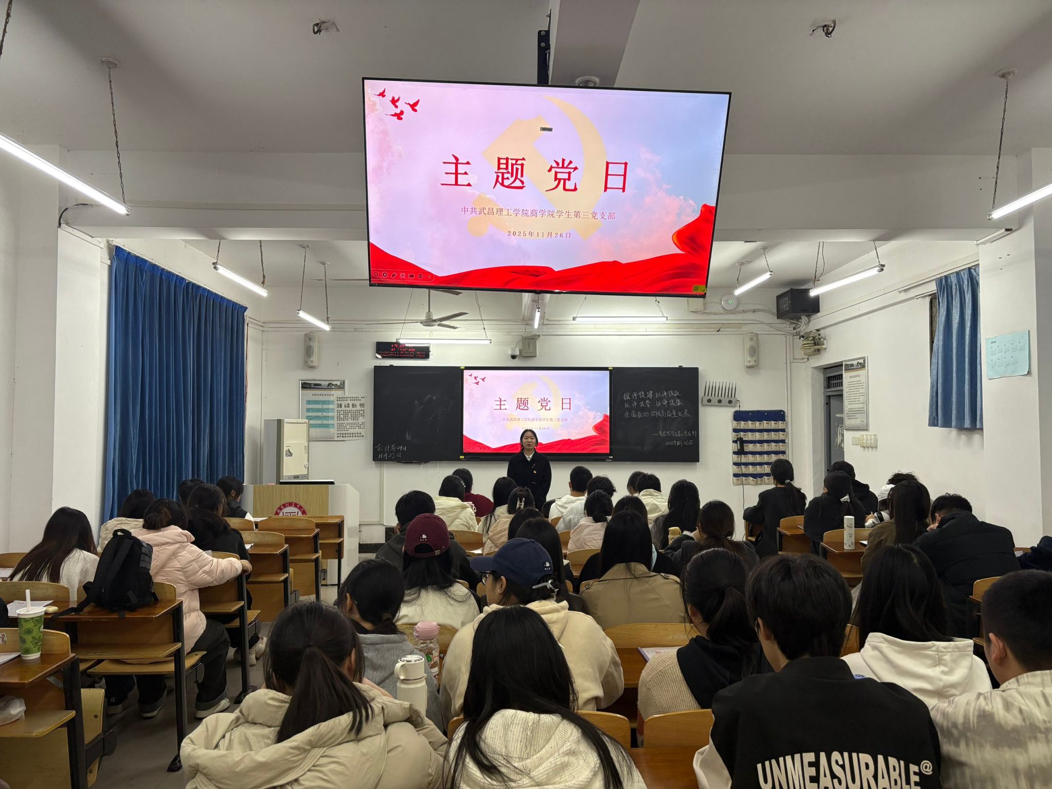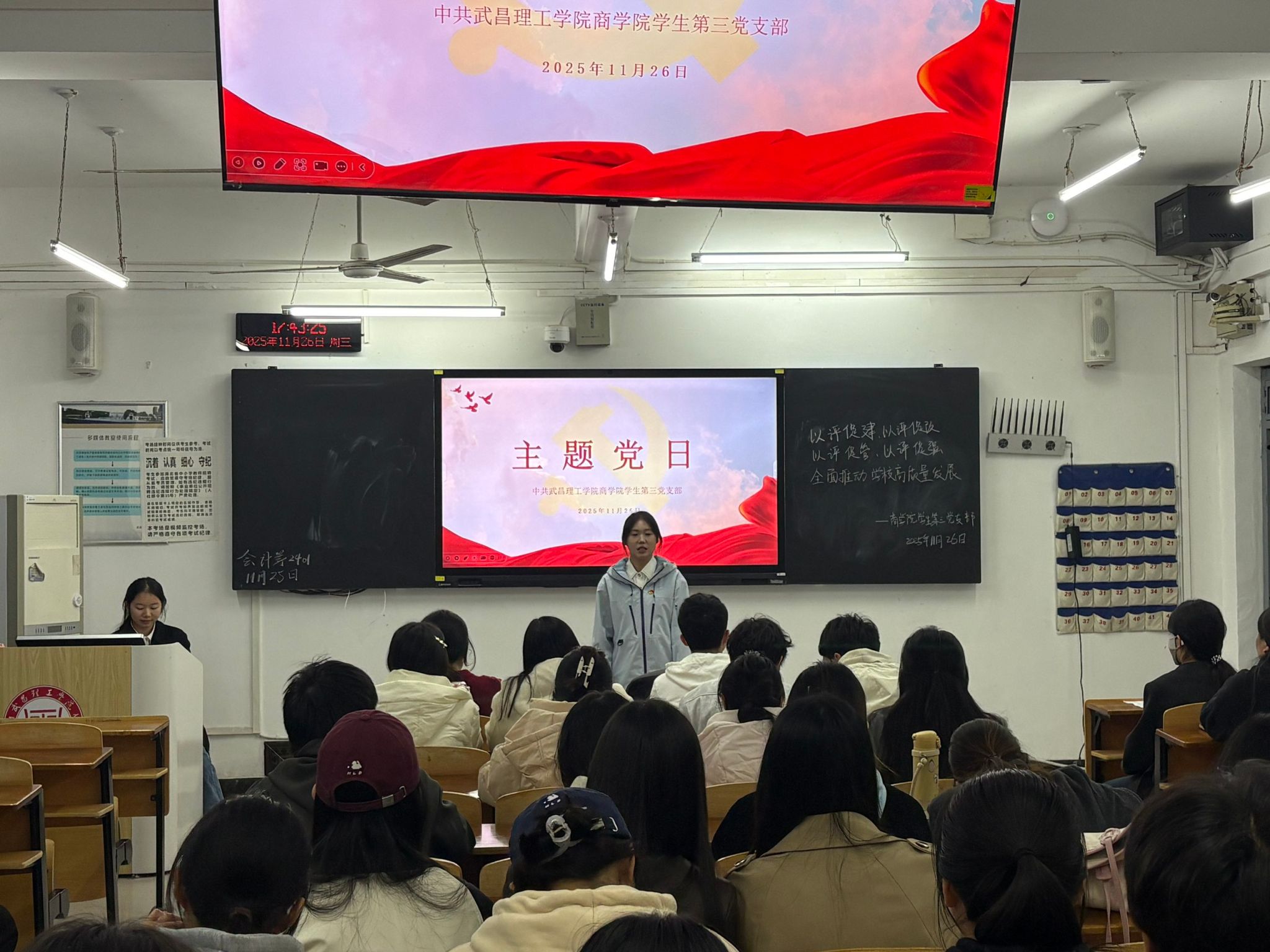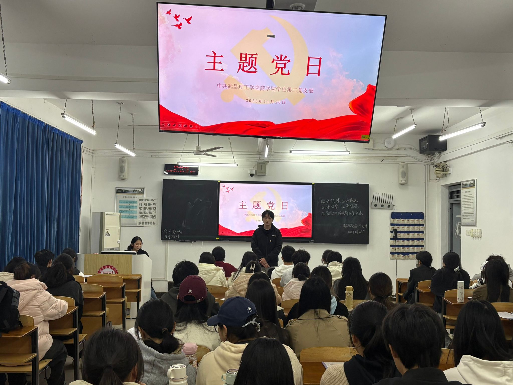 为深入落实学校高质量发展部署要求,锚定“以评促建、以评促改、以评促管、以评促强”核心目标,2025年11月26日下午18时,武昌理工学院商学院学生第三党支部在商学院412教室,开展以“以评促建,以评促改,以评促管,以评促强,全面推动学校高质量发展”为主题的党日活动。