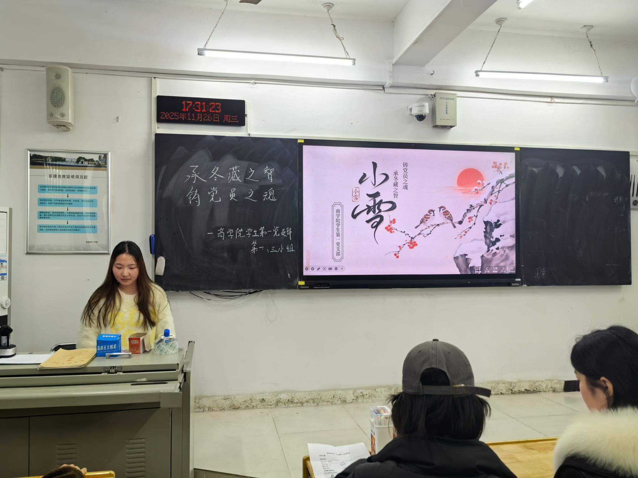 (通讯员 邹俊 报道)为让中华优秀传统文化与红色基因在青年群体中深度交融,进一步唤醒青年同志的责任担当、砥砺奋斗意志,2025年11月26日17时30分,商学院学生第一党支部第一、三组成员齐聚商学院 303 教室,开展以“承冬藏之智,铸党员之魂”为主题的十一月品牌特色活动,以小雪节气为纽带,让传统节气文化与红色精神在互动实践中实现深度交融。