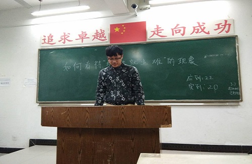 本次的会议由投资1503班的程佳龙同志主持。会议开始时,程佳龙同志先给我们介绍了两会的开展时间安排及生就业难的背景。其中,他分享了自己对大学生就业难的原因的三点分析。程佳龙同志认为大学生就业难主要是因为社会需求疲软、城镇的劳动了转移到了城市以及国内经济增速减缓。在程佳龙同志介绍完了之后,他又组织大家进行了五分钟的小组讨论,对这个社会热点进行了深刻剖析。接着,每个小组依次有人上台与大家分享了自己的看法与感悟。来自于工商管理1402班的肖文文同志谈论到:“我们应该多多的去适应这个社会,在大学时期多去解放自己的思想,提高个人能力,这样才能在这个竞争激烈的社会中找到自己想要的工作。