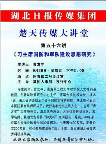 9月26日下午三点,“国防教育讲师团进媒体、读者网友进军营”活动在汉启动。启动仪式上,省国防教育讲师团成员、知名军事专家、海军工程大学教授黄友牛,以“习近平主席的军事战略思想研究”为题作了专题讲座。中共武昌理工学院商学院第一党支部副书记赵义等三名党员同志和入党积极分子参加了本场讲座。