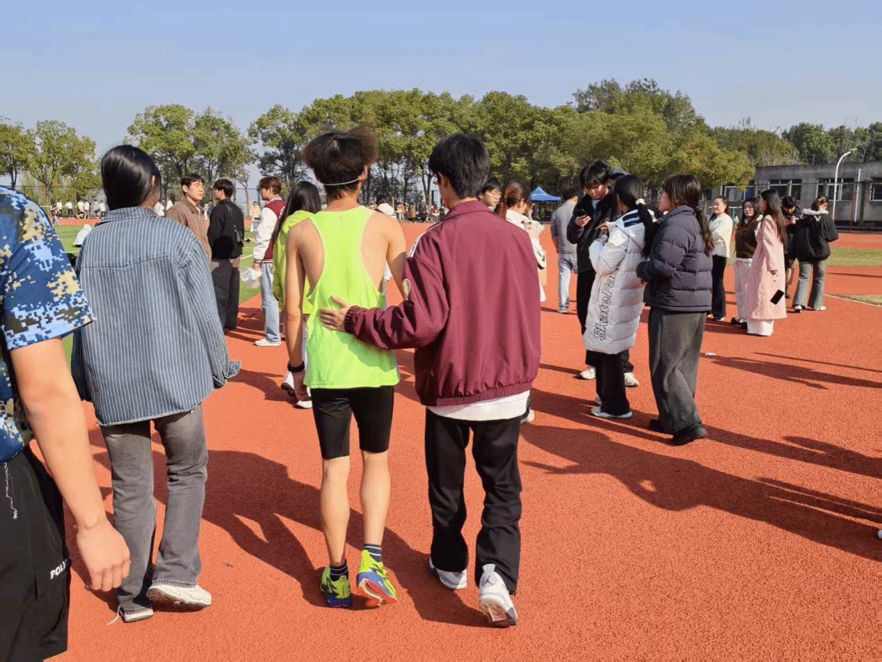 径赛区的赛道上,同样上演着温暖一幕。1500米决赛,选手田业涵冲过终点线后体力透支、几近虚脱,一位商学院的志愿者立刻上前稳稳扶住了他,一路细心搀扶至大本营休息,全程耐心照料。事后,记者采访到田业涵同学,他表示:“多亏了志愿者的照顾,奖牌的光芒属于运动员,但这场体育盛会的荣光属于每一位志愿者。你们是无名的英雄,是赛场上最温暖的底色。”