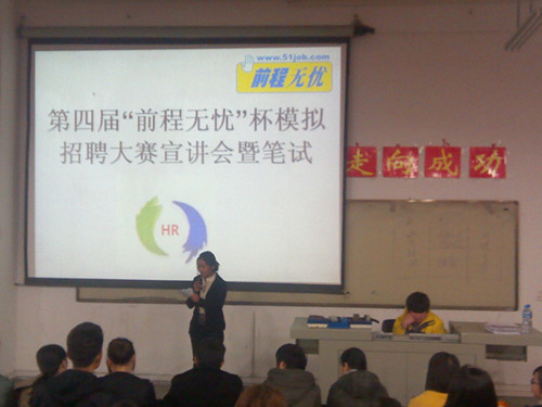 2012年12月2日晚上7:30,在武昌理工学院综合教学楼312大教室,这是“前程无忧”杯第四届模拟招聘大赛宣讲会暨笔试现场,主办方为人力资源教研室,承办单位是人力资源开发协会。许多参赛者很早就来到了现场做好准备工作,初次体验模拟招聘笔试,为自己以后的求职路增加经验。