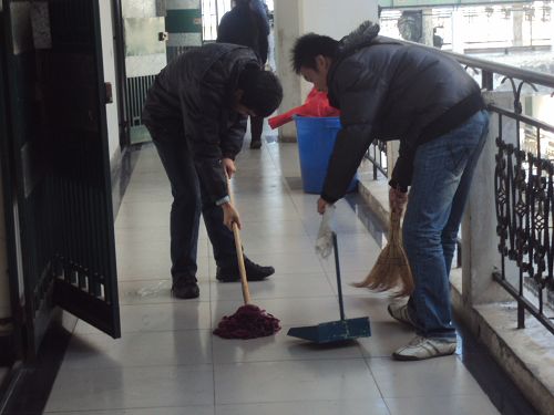 据悉,物流0902班在这次活动之前已经做好了活动策划,把整个班的同学分成了两支小分队;一支由班长带领,负责打扫商院的楼道与走廊;一支由劳生委员带领,负责打扫商院所有的素导办公室和院领导办公室。中午两点半左右,同学们已经拿好清洁工具,风风火火地开始了这次的清扫活动。物流0902班班长告诉记者:“从我们进校到现在已三月有余了,商院选择了我们,并为我们提供了广阔的发展空间,恰逢感恩节刚过,我们在这个时候组织这次活动就是为了以我们微不足道的行动为商院做点什么。”三点半左右,清扫活动接近尾声,同学们拿着清洁工具走出商院。虽然做了一个小时的清洁,但他们的脸上没有疲惫,取而代之的是满足的笑容。