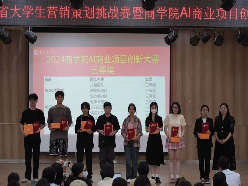随后获奖团队代表依次上台领奖,商学院院长沈易娟、副院长贺霄娟、商学院书记罗俊分别为他们颁奖,现场掌声雷动。在隆重的颁奖结束后,“天翼云杯”湖北省大学生营销策划挑战赛暨商学院 AI 商业项目创新大赛表彰大会圆满落下帷幕。