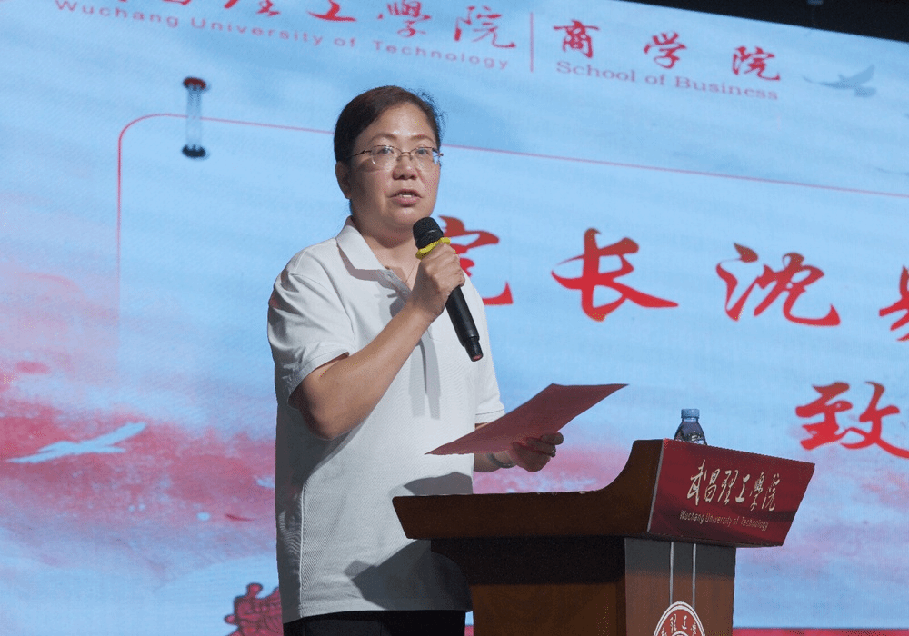 会议在庄严的国歌声中拉开序幕,全体师生起立奏唱国歌,现场气氛肃穆而庄重。随后,商学院院长沈易娟教授发表致辞。她首先对全体新生的到来表示热烈欢迎,并简要介绍了商学院的特色资源,尤其强调了学院“双师型”师资队伍的优势,既有国家级项目主持人,又有具备世界五百强企业实战经验的专家。提及人才培养,她期待新生们能在这里成长为具备专业能力、创新精神与社会责任感的新商科人才。