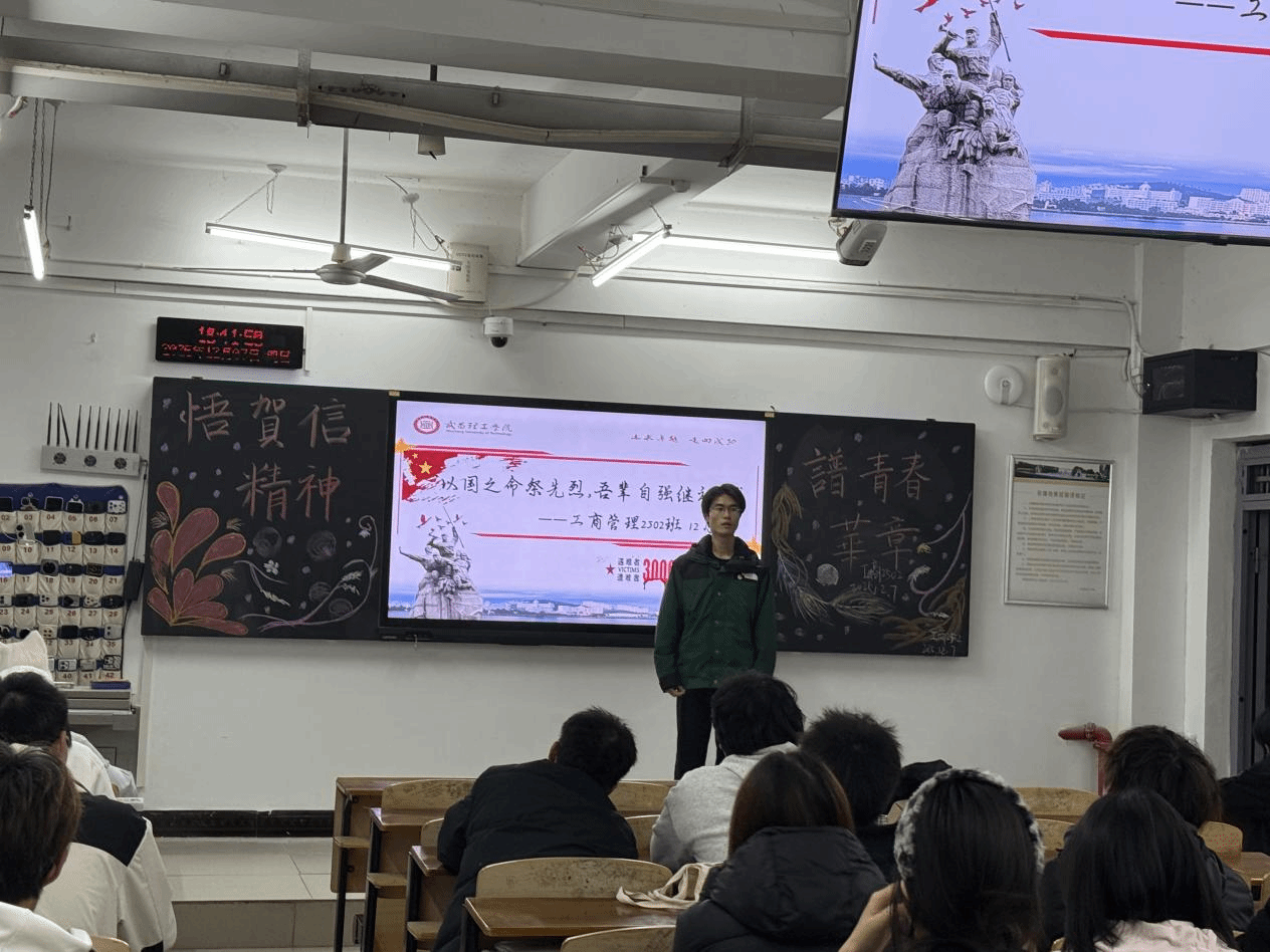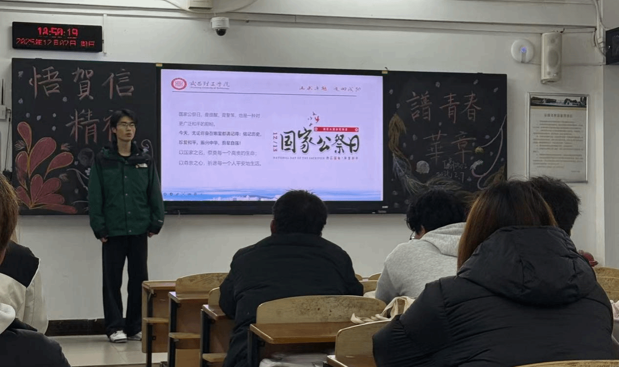 (通讯员 赵文钰 报道)为缅怀南京大屠杀遇难同胞,传承红色基因,增强青年学生的历史责任感与民族使命感,12月7日,武昌理工学院商学院工商管理2502班组织开展了以“以国之命祭先烈,吾辈自强继初心”为主题的国家公祭日教育活动,引导同学们铭记历史、珍爱和平、勇担使命。