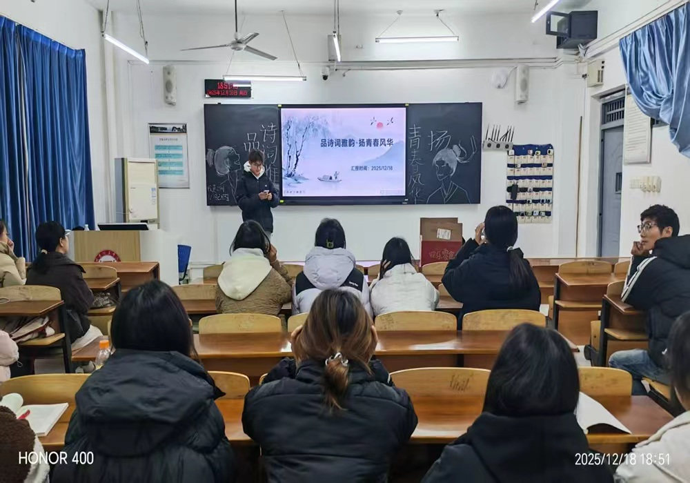(通讯员 龚袁媛 报道 )为传承中华优秀传统文化,丰富班级晚自习文化生活,增强班级凝聚力与向心力,武昌理工学院商学院会计2502班于12月18日晚自习在商院608教室成功举办了以“品诗词雅韵,扬青春风华”为主题的诗词大会。全班同学以分组竞赛的形式同台竞技,在诗词雅韵中感受中华传统文化的魅力,共同度过了一段充实而意义非凡的时光。