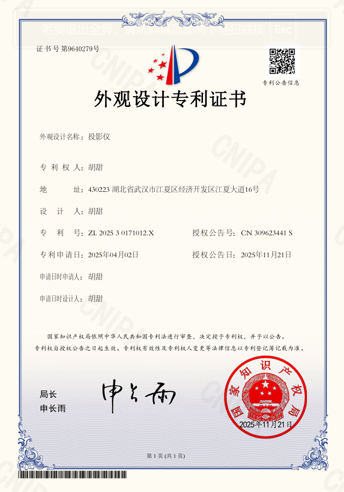 2 | 商学院 | 胡甜 | 投影仪 | 外观设计专利 | 2025-11-21 | 是 |